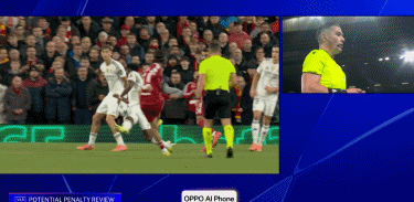 第32分钟,楚阿梅尼因手球被判定位球,主裁判观看VAR后取消定位球